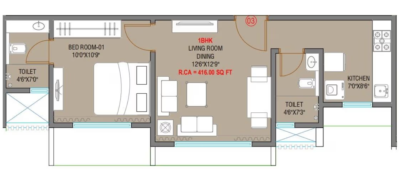 This apartment offers a highly functional and well-appointed 1BHK layout with generous room sizes and the notable inclusion of two toilets. While efficient, the direct living room entrance and the placement of the common toilet adjacent to the kitchen slightly detract from a truly premium designation.